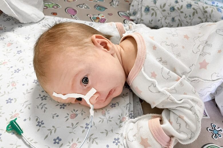 А дома Илья с женой поняли – Марьяна с трудом дышит, хрипит и хватает воздух. Они купили подушку-позиционер, чтоб малышка лежала в кроватке на боку и под уклоном, и ещё специальные бутылочки для детей с расщелинами нёба. Но даже с этими бутылками Марьяна не могла нормально есть, теряла в весе и с каждым днем всё тяжелее вбирала в лёгкие воздух. Ждать, когда у дочки вырастет челюсть, никто не планировал: Чешевы нарядили Марьяну в серый костюм со звёздами и поехали в больницу. С тех пор она живёт там под стеклянным куполом, куда подаётся кислород. Питается через зонд.