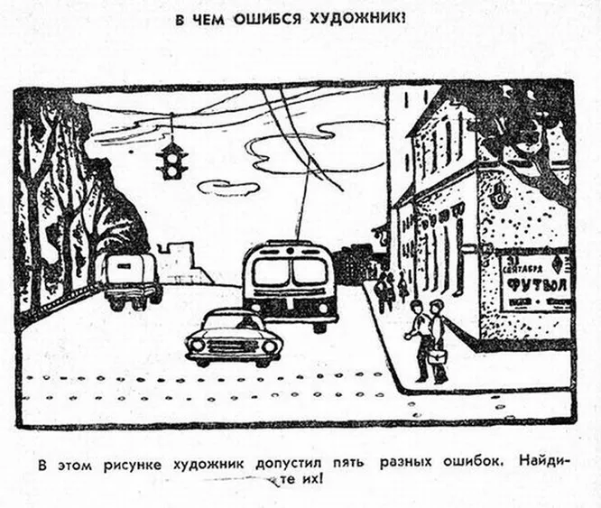 В советских журналах часто публиковали по-настоящему сложные логические головоломки. В одном из них опубликован вот такой интересный черно-белый рисунок. Все бы ничего, если бы художник изобразил улицу, не допуская ошибки. Присмотритесь к деталям и найдите пять ошибок. Сможете? Протрите глаза и внимательно рассмотрите картинку ⬇️ ⬇️ ⬇️ ⬇️ Смотрим, ищем, смотрим, ищем... ⬇️ ⬇️ ⬇️ ⬇️ Вы хоть что-то нашли? Пора бы уже переходить к ответу... ⬇️ ⬇️ ⬇️ ⬇️ ⬇️ ⬇️ ⬇️ ⬇️ ⬇️ ⬇️ ⬇️ ⬇️ Правильный ответ: Ну что, хорошо размяли мозги? Как быстро нашли все ошибки?