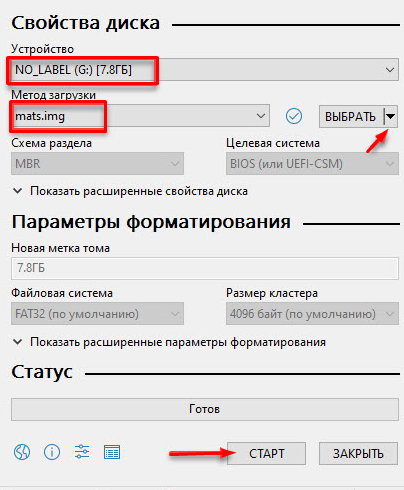 Сделать это можно при помощи Rufus. Запускаем его, в выбираем метод загрузки FreeDos, затем выбираем скачанный с официального сайте образ MATS/MOD и нажимаем «Старт».