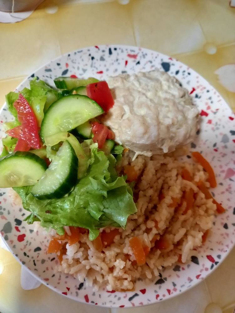 Вкусно и быстро! Этому рецепту месяц, забыла выложить! В тот момент я сдавала экзамены и на готовку времени было мало, а после дошиков и магазиных пельменей у меня обостряется акне. этот рецепт прям очень удобный. Ингредиенты: Котлеты рубленные, куриного филе, яйцо, рисовой муки, Специи , лука, Гарнир, Рис , Воды , Морковь , Лук, растительного масла, Специи , Салат, огурец длинный, помидорки средние, перца болгарского, Салат листовой , Масло оливковое , Специи Способ приготовления: Мелко нарезать куриное филе и лук. Добавить к филе и луку - яйцо, хорошо перемешать. Добавить к смеси муку, перемешать тщательно и дать постоять 5 минут. Формируем котлетки и выкладываем их на контейнер-пароварку. Переходим к гарниру. Режем лук и морковь. На режиме жарки обжариваем морковь и лук на масле 5 минут. Добавляем помытый рис и воду к обжарке, переключаем на режим "рис/крупы" 30 минут. Устанавливаем сверху контейнер мультиварку и закрываем крышку мультиварки. Салат. Тут все просто - нарезаем и смеши