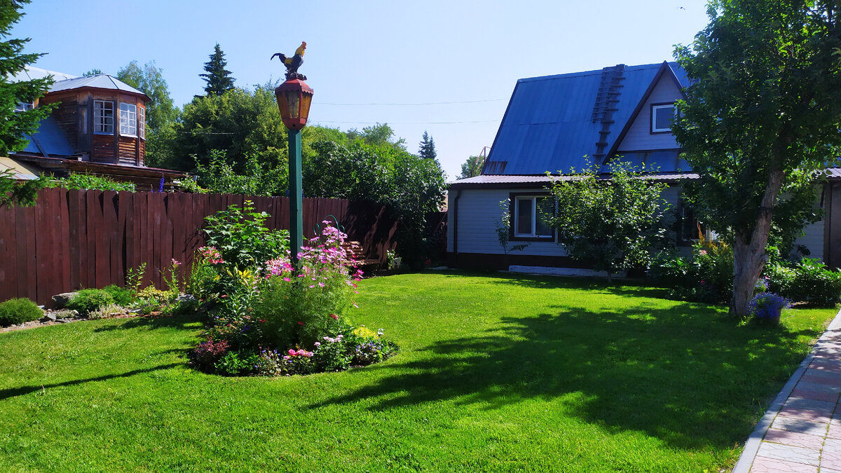 Блаженство! 25 градусов и ветерок. Погода на миллион долларов. Очень приятно работать в саду. Если бы еще не слепни. Но совсем-совсем идеально бывает только в мае и в августе, а у нас пока в разгаре июль. Я завела себе новую традицию. Чтобы работать с землей приходится надевать рабочую одежду. И у меня сейчас предбанник служит неким "перевалочным пунктом". С утра я захожу туда в домашнем платьице и чистых сланцах. Переодеваюсь, переобуваюсь, прихватываю шляпу и иду в огород. Когда же решаю сделать перерыв (на обед и полуденный отдых), снова захожу в баню, ополаскиваюсь, переодеваюсь в чистое и свеженькая возвращаюсь в дом. И почему я раньше так не делала? Очень удобно и разумно. Мелочь, конечно, но мне приятно). Вчера, наконец, постригла газон. Я не подступалась к нему две недели намеренно, потому что стояла жара. Только поливала с помощью вертушки, стараясь сохранить его зеленым. Ну а сейчас дождь основательно смочил землю, можно и постричь. Меня очень радует вид плотного, коротко с