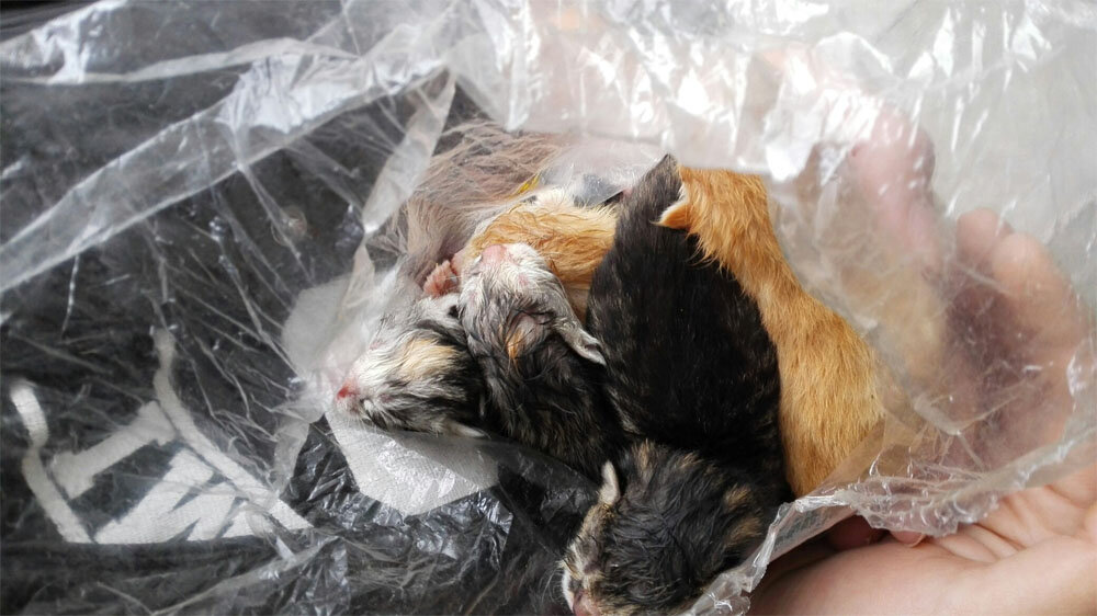 А там лежал завязанный пакет, в котором пищали 6 котят, по виду около месяца! Какая-то сволочь вывезла (или вынесла) малышей подальше и просто выбросила в воду. Но пакет не утонул, а прибился к берегу. Котята были все мокрые, один показался нам неживым, но когда муж его похлопал, тот стал дышать и кашлять.