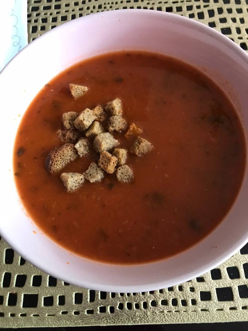 Обожаю томаты, томатный сок и все, что с ними готовят))) #июль Ингредиенты: Томаты, Сок томатный, Лук красный, Чеснок, Базилик, Оливковое масло Способ приготовления: Томаты залить кипятком, затем опустить в холодную воду, чтобы снять кожуру) я беру Азербайджанские, они мясистые, сладкие, крупные и сезон как раз!) Режем их и заливаем соком, ставим на огонь. Лук нарезаем, чеснок пропускаем через пресс, все обжариваем на масле. Томаты закипели) отправляем к ним лук и чеснок, добавляем базилик (у меня он в заготовке с оливковым маслом) всё блендерим и тушим ещё минут 10-15. Суп готов! Для подачи я добавляю гренки) быстро, вкусно) Можно кушать в холодном виде!)