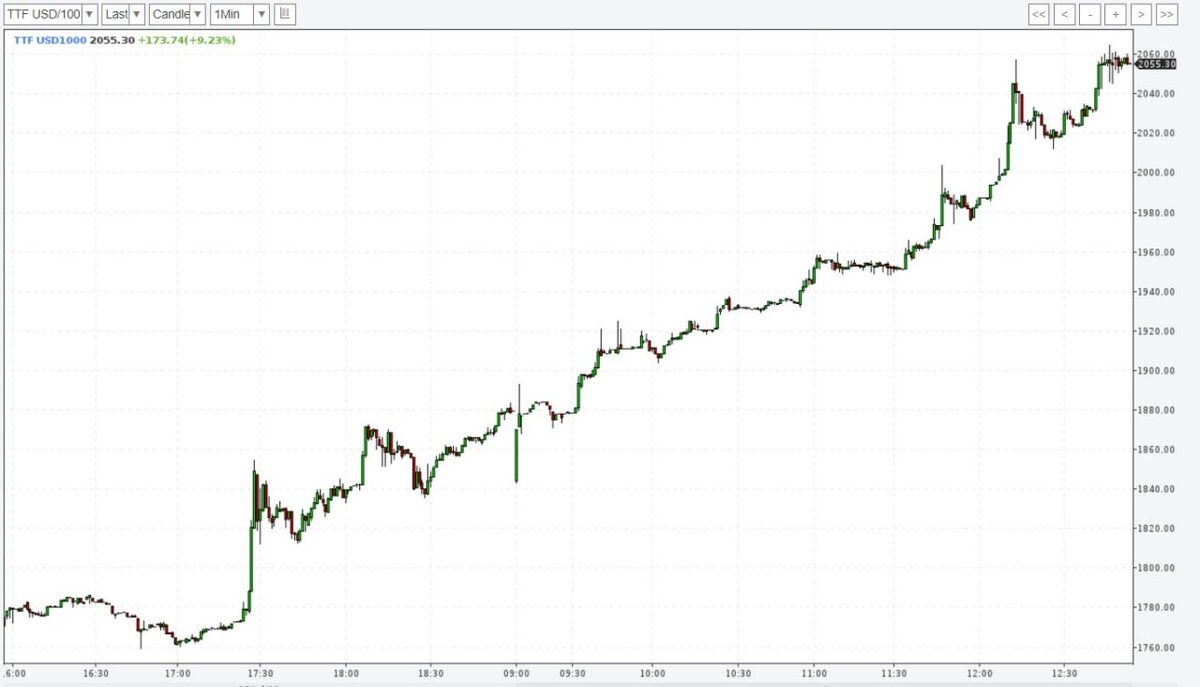Биржа ICE сообщает, что впервые с марта этого года цена за тысячу кубометров газа составляет более $2000. Рост цен, продолжающийся со вчерашнего дня, обусловлен как заявлением «Газпрома» об остановке эксплуатации еще одного газотурбинного двигателя Siemens на КС «Портовая», так и настороженной политикой Европы по отношению к российскому голубому топливу в целом. Ранее министры энергетики Европы провели экстренное заседание в попытке договориться, как же странам Еврозоны снизить риски зависимости от российского газа. В планах европейской комиссии — снижение потребления газа на 15%, что, по замыслу чиновников, должно привести к добровольному участию стран по отказу от «путинского влияния». Тем не менее, переговорщики, хотя и бл