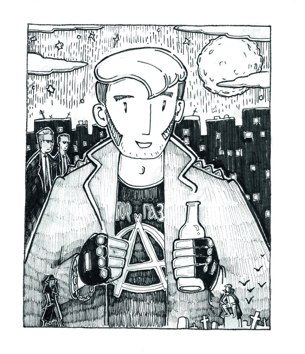 В этот раз я хочу начать с разбора постера третьей главы, ибо здесь я увидел узнаваемые мне детали: здесь будут фигурировать чуваки, которые одеты как Люди в чёрном, да и к тому же они как раз и являются отсылкой к "ЛВЧ". Также несложно догадаться, что Иван любит творчество Сектора газа, поэтому директор лавки является панком, а на футболке фигурирует символ группы. Многие могут упустить один забавный визуальный момент. Посмотрите внимательно на футболку: там фигурирует название "Сектор газа", но автор создал текстовую отсылку на ГорГаз. Хитро придумано! Последняя визуальная деталь, которую я хочу отметить, касается вампирской тематики. Посмотрите вниз и вы увидите чувака, сидящего на надгробии. Сказать честно, я точно не знаю, к чему именно здесь отсылает автор, но у меня всплывают ассоциации с песней "Укус вампира" Сектора газа. Очень приятно, когда автор оставляет отсылки, понятные для как можно большего круга людей. Начинается всё с сообщения, где нам показывают, что директор не п