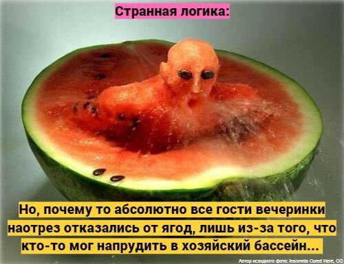 Маленький Витя, смотря со всей своей большой семьей по телевизору соревнования по плаванью брасом - чётко осознавал, что пловцом ему точно не быть. Ведь при ежедневной раздаче еды - он слишком часто хватал воздух. ____________________________________________________________________________________ Начало девяностых, предупреждающий плакат на заборе американской птицефермы: "В Россию пойдёшь – ляжки потеряешь!" ____________________________________________________________________________________ Огурец, банану, лежащему рядом с ним на полке в магазине: - Ну чего, такой сутулый? Всё таки тяжело тебе было в Африке... ____________________________________________________________________________________ Мужчина со смешной внешностью зарёкся водить женщин в ресторан. Так как чем больше он был с ними щедр, тем всё более и более - им там становилось не до смеха… ____________________________________________________________________________________ В море на грузовом судне случается авария. Судн