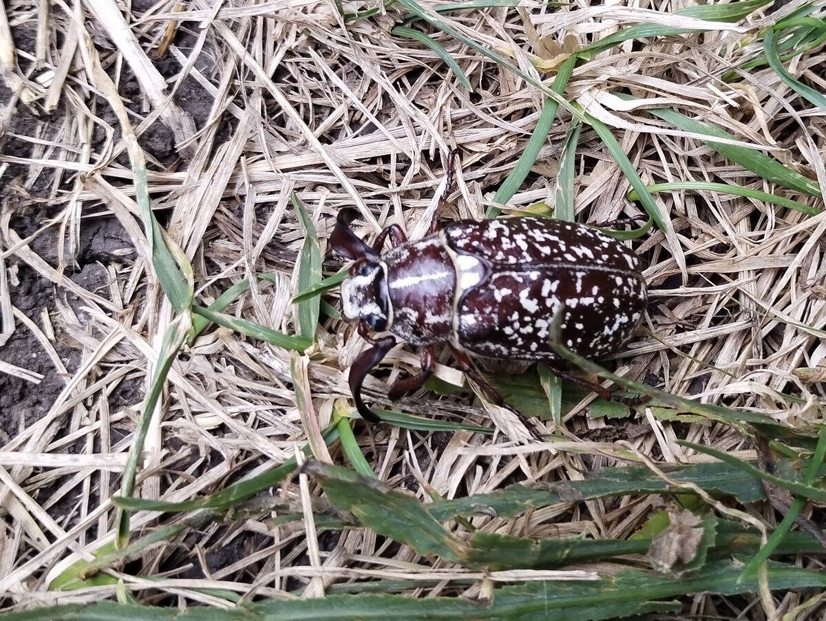 Каждый раз, выходя из дома, говорю себе: телефон возьми! И каждый раз мой Близнец-пофигист отвечает, мол, да ла-ан, чО там идти-то?! До тубзика и обратно (ага, 92 шага) или до душа и обратно (а это 84 шага)! ЧО мы там не видали-то? Вот и в этот раз он победил. Я пошла вниз, "в Париж", как мы изысканно именуем кабинет уединения, без телефона. И вдруг в конце пути вижу на тропинке жука! Огромный, красивый! Вот и здрасьте, вот и не бери с собой фотоаппарат, ага!!! Пришлось мчаться назад в дом. Про "Париж" и не вспомнила даже! Примчалась, гляжу ещё тут, не улетел! Ну я давай его снимать! И так, и так! Красивый! Поснимала, помчалась обратно наверх - Андрею фотографию своей находки показать. Повосхищались вместе. Я припала к Интернету. Скажи, говорю, мне, Яндекс, что за жук тёмно-коричневый в пятнышко? Мне сказали, что это мраморный хрущ, вредитель виноградников. Вот этому верю! Такой только сядет на лозу, она и обломится. Огромный жук! Наверное, больше жука-оленя. Нашла название, выдохнула.