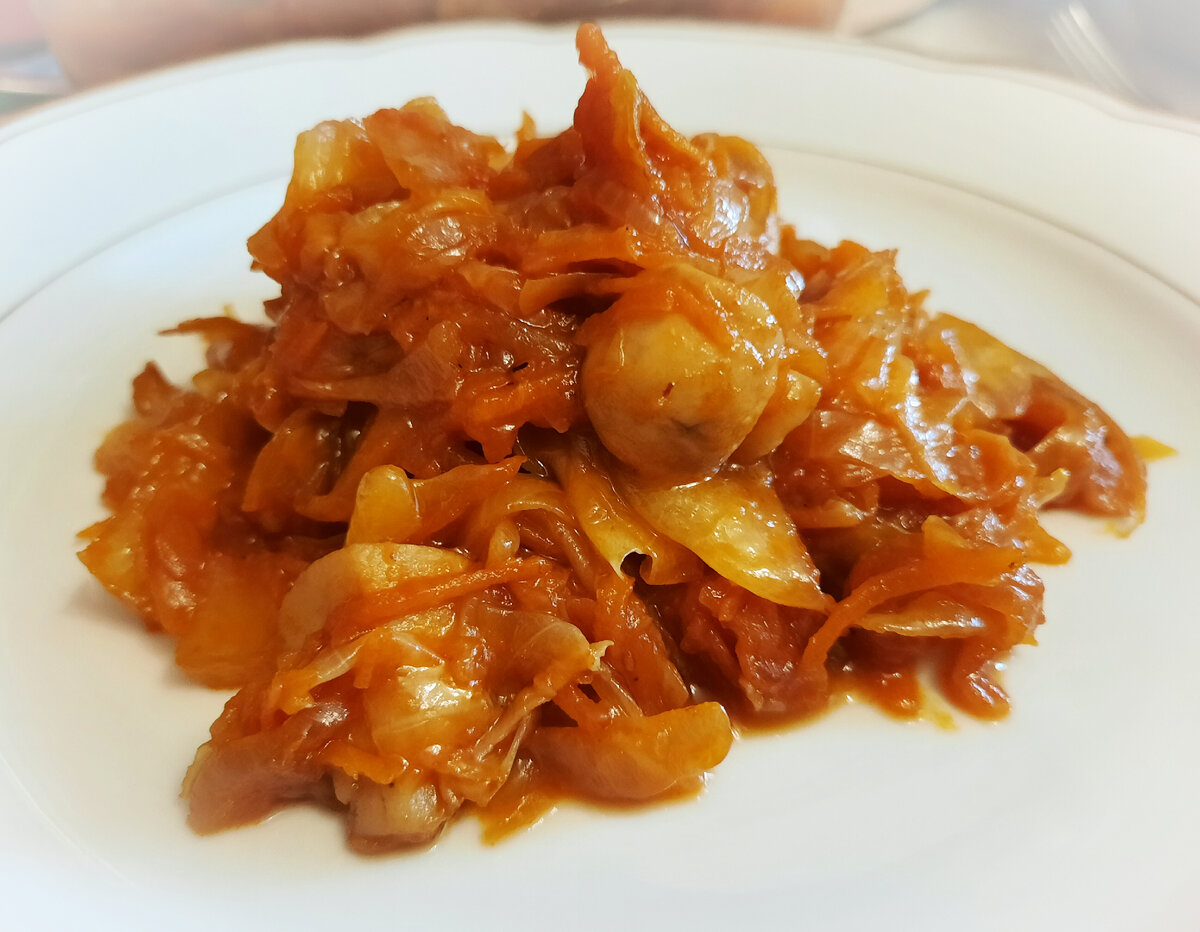 - Перемешать овощи с пастой, добавить ½ стакана воды, довести солью и перцем до вкуса, накрыть крышкой и тушить до готовности капусты.