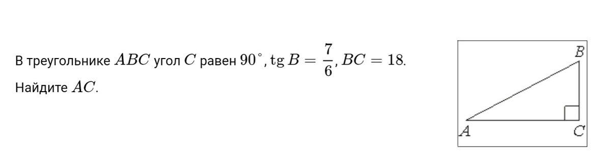 Задача 1 Решение задачи 1. Тангенс это отношение противолежащего катета к прилежащему катету. Тогда tgB=AC/BC, поэтому АС=tgB•BC=(7/6)•18=21. Ответ: 21. Задача 2 Решение задачи 2. Здесь нужно использовать основное тригонометрическое тождество: sin²a+cos²a=1. Тогда cos²a=1-sin²a. Производим вычисления и получаем: cos²a=4/25, откуда cos a= 2/5=0,4. Ответ: 0,4. Задача 3 Решение задачи 3. Площадь треугольника можно найти также и по формуле: S=1/2 • а • b sinq, где а и b смежные стороны треугольника, а sinq синус угла между сторонами а и b. Подставляем известные величины в формулу и получаем: S=1/2•6•10•1/3=10. Ответ: 10. Задача 4 Решение задачи 4. Рассмотрим треугольник АВH. В нём не известен только угол АВH. Так сумма углов в любом треугольнике равна 180⁰, то угол АВН= 180-(90+37)=53⁰. Ответ:53. Задача 5 Внутренний угол С треугольника и внешний угол при вершине С являются смежными. А сумма смежных углов равна всегда 180⁰. Поэтому искомый внешний угол равен: 180-133=47⁰
