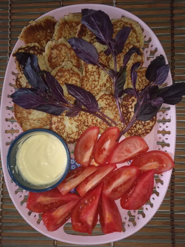 #літо Ингредиенты: средний кабачок, крабовых палочек, яйца, панировочных сухарей, Паприка, Соль, Прованские травы, чеснока, Помидоры, майонеза, Свежий базилик, Подсолнечное масло Способ приготовления: Мелко порежьте очищенный кабачок, добавьте мелко порезанные крабовые палочки и яйца. Взбейте все вместе блендером. Теперь добавьте панировочных сухарей, паприку, прованские травы и соль. Можно еще добавить измельчённый зубчик чеснока. Перемешайте. Пожарьте оладушки на разогретом подсолнечном масле с двух сторон до золотистой корочки. Осторожно переворачивайте при помощи лопатки и вилки. Они очень нежные... Выложите готовые оладушки на блюдо. Рядом положите порезанные помидорки и соус (майонез + зубчик чеснока). И украсьте листиками свежего базилика.