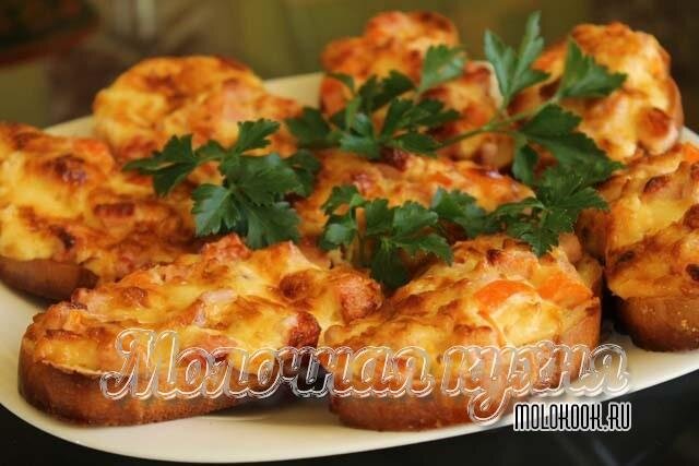 Ломтики батона смазать кетчупом, смешанным в равной пропорции с майонезом. Сверху разложить нашинкованный тонкими кольцами лук и порезанную кубиком колбасу. Посыпать мелко тертым сыром. Прогреть при мощности 600 Вт 3 минуты.
