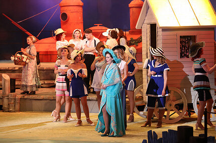 Музыкальные достоинства нового спектакля удалось раскусить не сразу. Предоставленное место в глубине центральной ложи – локация, акустически проблемная, звук туда идет плохо, поэтому весь первый акт не покидало разочарование: голоса и оркестр звучали тускло и обезжиренно. В антракте пришлось искать что-то более подходящее, что сделать было непросто: в последний вечер сезона на премьеру, кажется, пришел весь Минск. Как в студенческой молодости, удалось пристроиться на галерке – зато музыкальные впечатления оказались на пару порядков интереснее. Правда, вылезли другие недостатки. Во-первых, с верхнего яруса отлично видна вся постановочная кухня: например, как фальшиво выныривают из люка подлодки матросы Белькоре (на самом деле просто приходят из боковой кулисы, что видно всему ярусу) или как более чем буднично рабочие сцены катают парусник. Похоже, постановщики брали в расчет только те ракурсы, что увидит на премьере дирекция и завсегдатаи партера – до самой же верной публики, обитателей галерки, им особого дела нет. Во-вторых, сильно мешало «усовершенствование» партитуры: из динамиков постоянно шел «приморский фон» – крики чаек и плеск волн, – особенно слышный как раз на верхнем ярусе. Его, очевидно, добавили для общего настроения, но как-то «забыли», что Доницетти таких звуковых впечатлений не предполагал, и на речитативах или тихом пении они откровенно портили музыкальную ауру спектакля.