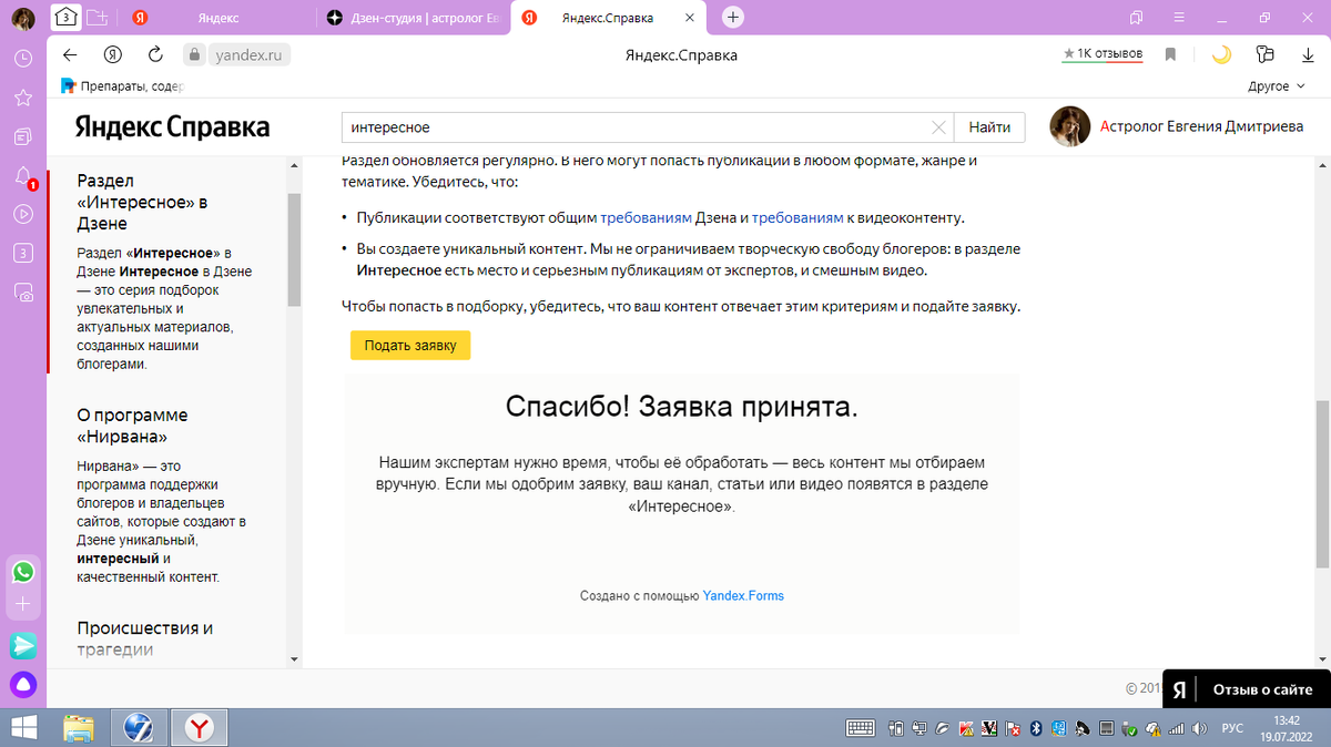 Поскольку скрин с экрана компьютера вставить в пост простым способом нельзя - приходится писать аж целую статью. Итак: 1. Подала заявку в раздел Дзена"Интересное" Подумала "А почему бы и нет?", после того, как в новой статье канала "ИГОРЬ | ПРОДЗЕН" автор опять напомнил, что такой раздел ещё "жив и здравствует". Посмотрим, как пойдут подписки: если активно подскочат - значит, как сказал почтальон Печкин: "...вашу маму и там, и тут передают... ". Определить, попала ли я в "Интересное", в отличии от программы поддержки авторов, в которой я уже участвовала в марте месяце, будет сложнее, т.к. эту заявку уже не подтверждают, а просто твои материалы там начинают выкладываться. Для неё выбрала наиболее читаемые и обсуждаемые за последнее время статьи, за исключением мунданно-политических, т.к. они могут быть неоднозначно восприняты проверяющим (может придраться по любому поводу от
