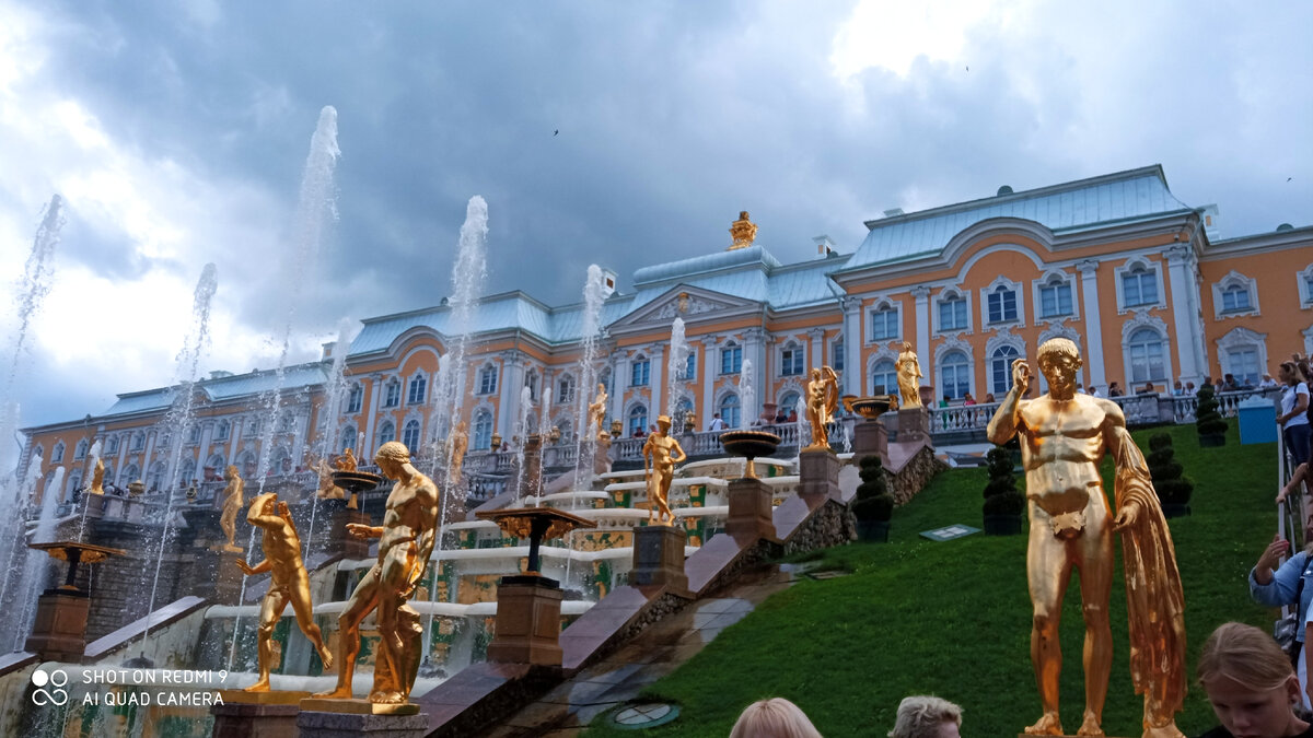 Это был насыщенный на эмоции и впечатления день! Первой меня с юбилеем поздравила питерская погода, в 4 утра пошел дождик, что было ожидаемо, т.к. на мой день рождения всегда идет дождь. Ну, естественно, муж с цветами…. А, далее незабываемая экскурсия… Петергоф, Кронштадт, форды…. И это все за один день! Обширная программа на 8 часов. Мы купили экскурсию, т.к не хотелось стоять в очередях, добираться на транспорте. Ни сколько не пожалели. Пока ехали, слушали гида-экскурсовода. Первой остановкой был Петергоф!!! Минуя кассы с очередями, мы прошли на территорию Нижнего парка и фонтанов (Верхний парк закрыт на реконструкцию). Это словами не передать. Красота, богатство, изящество, мощь… Очень много народу, но сфотографироваться можно без напряга. Фонтаны завораживали своей красотой, я фоткала, наверное, каждый шаг. Посещение Дворца не входило в экскурсионную программу, но парк с фонтанами это компенсировал в полной мере. Дворец приеду осматривать в зимнее время. Фонтаны б
