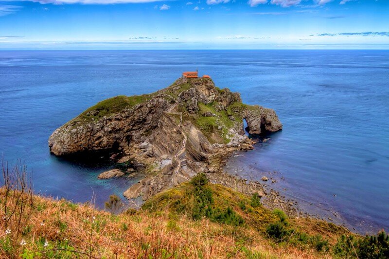 Каменный остров Гастелугаче (Gaztelugatxe) находится у побережья Бискайского залива. Огромный старинный мост-эспланада связывает этот кусочек суши с материком. В самой высокой точке острова стоит скит Иоанна Крестителя, построенный в X веке – к нему стремятся паломники, путешествующие по Стране Басков. В восточной части островка морские волны проточили две естественные сквозные арки.