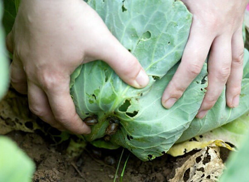 Слизни. Их отыскать проще-простого, достаточно выйти с утра и осмотреть капусту. Слизняков очень легко заметить, все-таки размер заметный, к тому же цвет значительно отличается. Против слизней уже довольно много способов придумано, можно собирать вручную или ставить ловушки. Но конечно, самое простое — обработка. Из народных средств — опудривание золой или обработка мыльным раствором. А в любом садовом магазине предложат химические средства, наиболее популярные — «Гроза» или «Хищник».