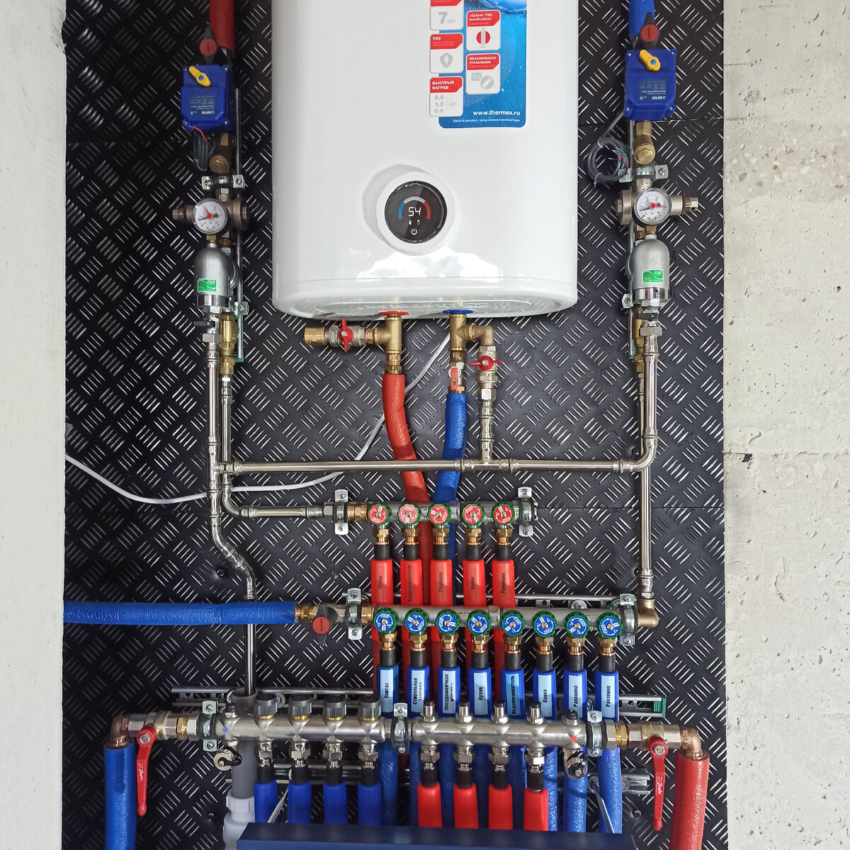 Закончили интересный проект в одной из новостроек в пос.Коммунарка. Попался оригинальный заказчик, с интересными задумками. Вы когда нибудь встречали в квартире бак-гидроаккумулятор?Я тоже не встречал. Но на этом объекте нас попросили его смонтировать. Он обеспечит запасом воды квартиру в случае отключения центрального водоснабжения. Соответственно, места под него понадобилось не мало. Стену за инсталяцией мы шумоизолировали, а поверх смонтировали алюминиевый профлист, покрашенный в черный цвет. В сантехшкаф поместился водонагреватель накопительный на 50л, вводные элементы для ГВС и ХВС, коллектора отопления и водоснабжения. Стены будут зашиваться шумоизоляцией на каркасе, поэтому разводка труб водоснабжения и канализации была сделана без штробления, так называемая "наружная прокладка". Оборудование и материалы используемые на объекте: 👍 Запорный кран фирмы Oventrop - полностью перекрывает всю воду в квартире. 👍 Редуктор давления Itap (мембранный) - выравнивает входящее давление до