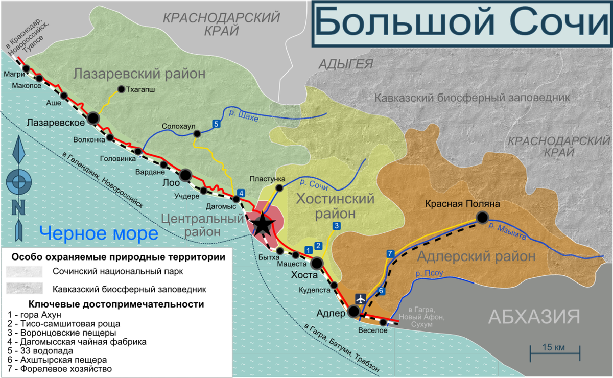 Будем говорить прямо, до олимпийских игр в России в 2014 году Сочи был совсем небольшим и непримечательным городком на берегу черного моря, но с момента сакральной жеребьевки все изменилось, и Сочи престал быть просто городом на побережье, и превратился в большой административно территориальных округ, который включает в себя целых 4 района: Адлерский (с городом Адлер и одноименным аэропортом), Хостинский район, Лазаревский район и Центральный район (самый маленький, куда и включен г.Сочи). И весь этот прекраснейший квартет, в настоящее время носит имя Большой Сочи.
