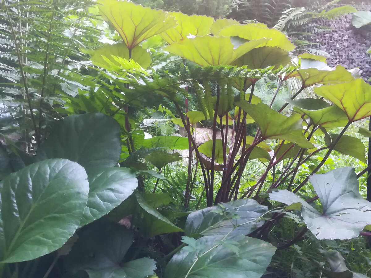 И что вы думаете, я сегоднся вышла полной уверенностью, что хосты и злаки просто уже требуют внимания! Но зайдя за угол, поняла, что им сегодня опять не светит! Джунгли в саду под Питером... И где ж такое видано! Любой нормальный дачник повертит у виска! А где градки? Где теплица? Где картошка? Какие джунгли? Обыкновенные! Маленкие такие, на склоне за домом! Внучка уверяет, что это ее "тайное место", что там единорог прячется, что можно его слезы собирать! Когда смиотришь снизу вверх на такие заросли, кажется, что ты в джунглях. Настоящих! И сейчас из кустов выскочит какой-нибудь звереныш! Бузульнику это место очень понравилось. Нынче он стал еще больше! Правда цвести пока не собирается... Где-то там высоко есть голубое небо. Оно просвечивает сквозь кроны деревьев и лиан, обвивших старую дикую яблоню. А здесь, внизу, среди папоротников, пристроился туевик. Нынче ему повезло. Весна не сильно зацепила его. Под ногами среди камней свободно себя чуствует молочай кипарисовый, овсяница си
