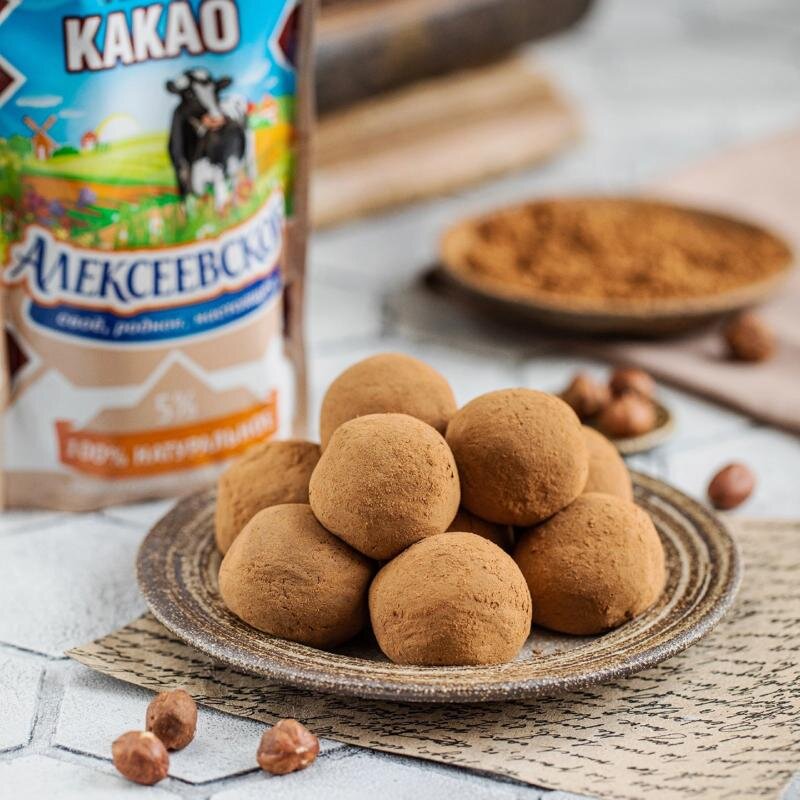 Домашние конфеты ничем не хуже магазинных сладостей, даже лучше - ведь в них нет искусственных добавок, красителей и консервантов. В рецепте в качестве начинки используется карамелизированный фундук, но вы также можете приготовить конфеты с вишней, черносливом или миндалем. А особенный, шоколадно-сливочный вкус десерту придает сгущенное молоко с какао «Алексеевское». Домашние конфеты с орехами, сгущенным молоком и какао Ингредиенты: Способ приготовления: 1. Вылить воду в сковороду, поставить на плиту, добавить сахар, нагревать до полного растворения сахара. Поместить в полученный сироп орехи, карамелизировать. Выложить орехи на пергаментную бумагу, дать остыть. 2. В чаше смешать сухое и сгущенное молоко с какао, сахарную пудру и коньяк до однородной консистенции. 3. Из полученной массы сформовать небольшие лепешки, в середину каждой положить карамелизированный орех. Скатать из лепешки плотный шарик. 4. Шарики с орехами обвалять в какао-порошке, выложить на тарелку, предварительно покры