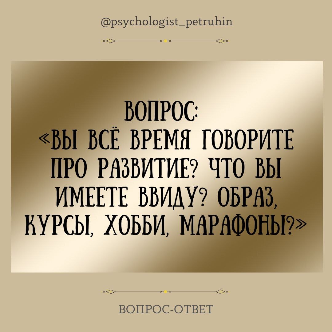 Вопрос: «Вы всё время говорите про развитие? Что вы имеете ввиду? Образ, курсы, хобби, марафоны?». Развитие – это изучение себя и жизни. Изучение механизмов работы своей психики и своего Ума, чувств, инстинктов, интуиции, и т.д. Чтобы научиться жить с собой и со своим организмом в гармонии. Это изучение своих ресурсов, возможностей, потенциала и развитие всего этого. Улучшение, приумножение. Это личностное развитие. Межличностное развитие – это изучение механизмов и законов здорового и гармоничного построения отношений. Чтобы выстраивать полноценные отношения с людьми и партнёром. И стать значимой частью людей. Без этих знаний нельзя ничего здорового выстроить и стать ценным партнёром. Далее. Изучить законы жизни (природные законы) чтобы жить с ними в гармонии. Далее. Изучить социальные законы: как люди социально растут и развиваются, чтобы гармонично встроиться в социум, занять своё место и реализовать свой природный потенциал в социуме. Вот первые шаги личностного развития. Дальше е