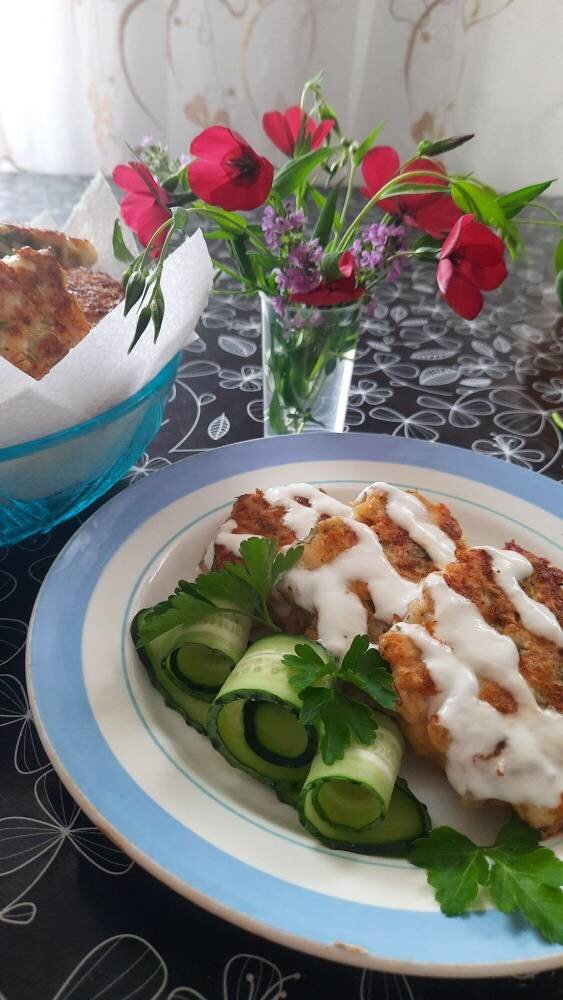 Такие котлеты получаются сочные и вкусные. #июль Ингредиенты: Филе грудки, яйца, сыра, чеснока, сметаны, ц/з муки, укропа, Соль, Перец, Масло для жарки Способ приготовления: Филе нарезать мелкими кубиками. Лучше нарезать подмороженную. Лук и чеснок мелко режем и добавить к фаршу. Добавляем остальные ингредиенты и мелко порезанный укроп. Все перемешать и пусть немного постоит. Выкладываем по 1 ст.л. на разогретую сковородку и жарим с 2-х сторон на медленном огне. Выкладываем на бумажную салфетку. Подаем с овощами.
