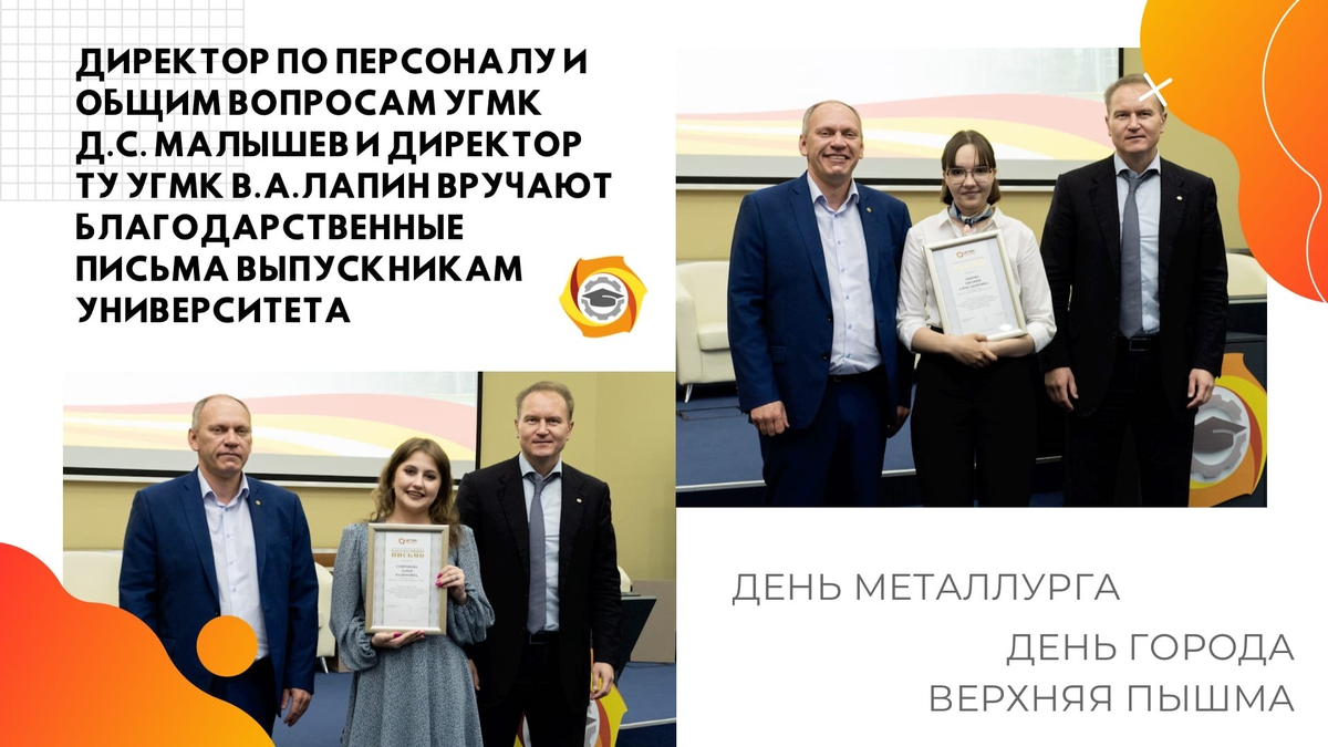 В канун дня города Верхняя Пышма и профессионального праздника День металлурга муниципальными и корпоративными наградами отмечено несколько представителей Технического университета УГМК: 1. За активное содействие в профессиональном становлении молодёжи и формирование имиджа городского округа Верхняя Пышма, как территории опережающего социально-экономического развития, Благодарственными письмами главы городского округа Верхняя Пышма и Думы городского округа Верхняя Пышма награждены: 2. за активное развитие патриотических традиций и добровольческого движения городского округа Верхняя Пышма Благодарственным письмом Думы городского округа Верхняя Пышма, награждён менеджер по работе со студентами Кичигин Леонид Викторович. Благодарственными письмами Уральской горно-металлургической компании награждены выпускники ТУ УГМК по направлению «Автоматизация технологических процессов и производств» Софронова Дарья Вадимовна и Зыкова Евгения Александровна.