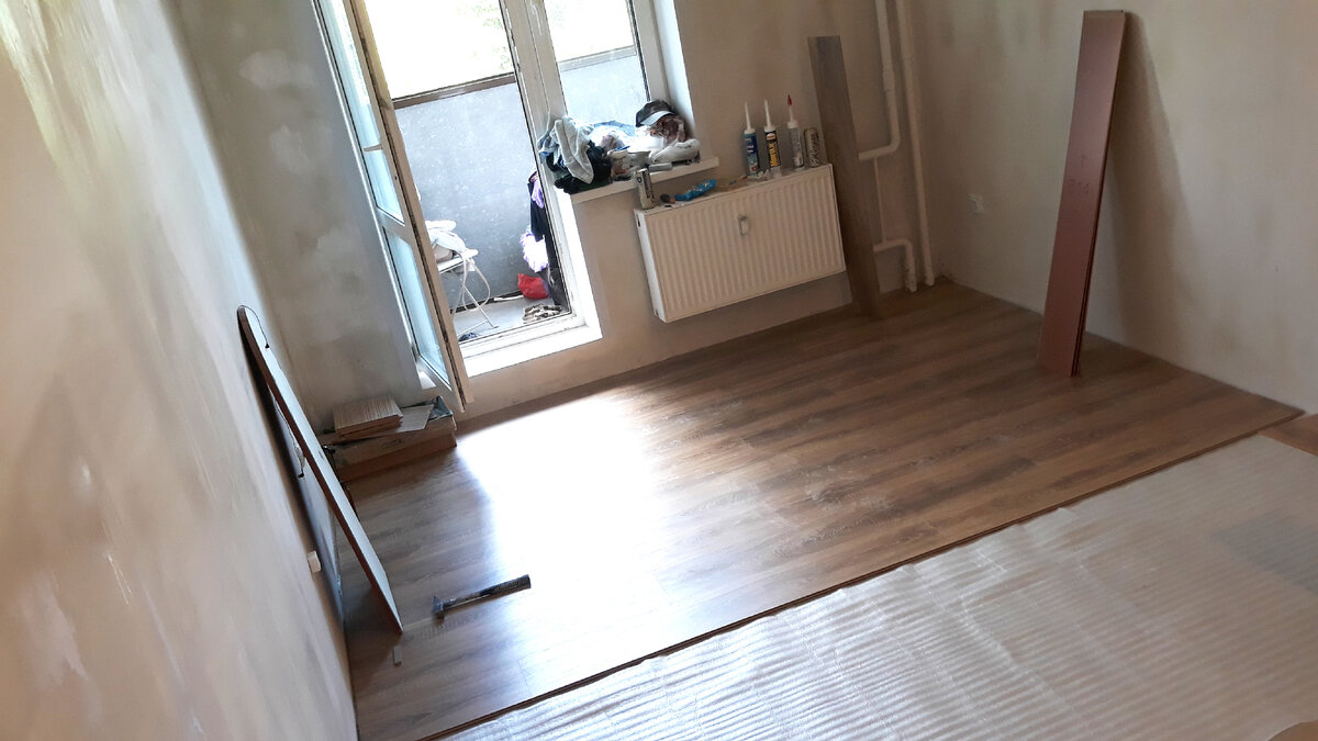 Так как в пятницу мы закупили ламинат, то работа в субботу началась с его укладки.