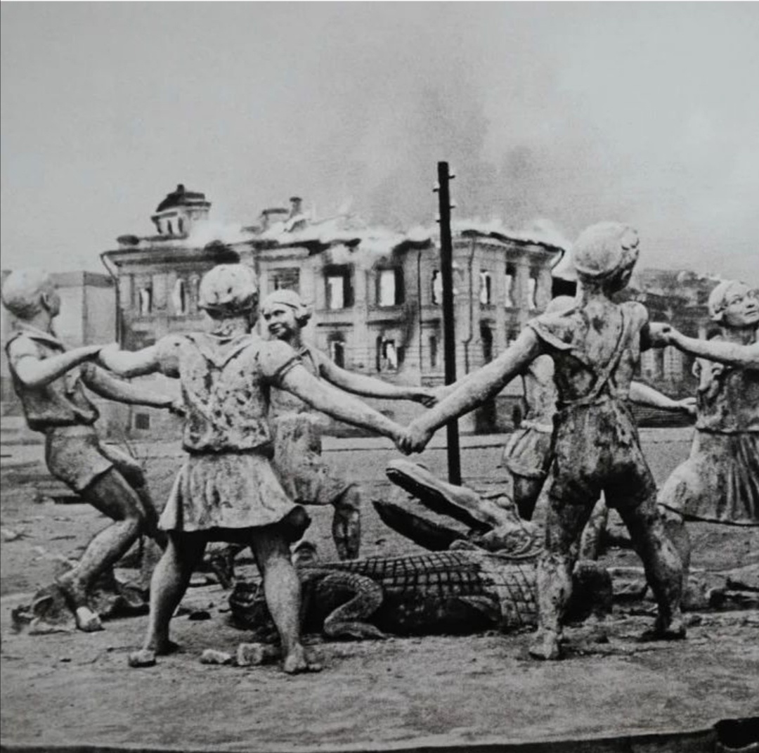 23 августа 1942 года в день первой бомбардировки гитлеровцами мирного Сталинграда, все информационные агентства Советского союза облетела фотография с подписью «23 августа 1942 г. После авиационного налета гитлеровской авиации». На ней был изображен фонтан в виде хоровода детей вокруг крокодила.