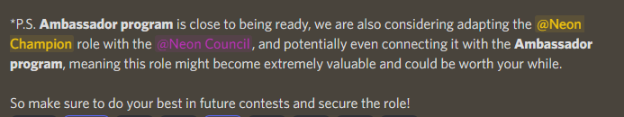 Всем привет! Думаю каждый хотел бы зарабатывать деньги, при этом сидя дома, без надобности выходить на 12-ти часовую смену. Вот один из таких вариантов: Амбассадорская программа в проекте "Neon Labs". Давайте разберем, что такое Амбассадорская программа и как на ней можно заработать. 1. Амба (в простонародье) - это своего рода "обязательства" перед комьюнити. Для того, что бы стать амбассадором, вам необходимо всячески помогать развитию (в данном случае) дискорда. Что подразумевается под "помощью в развитие"? Все просто, необходимо вносить вклад в сообщество, к примеру: переводы официальных статей, написаниуе своих (на рус. и англ. языках (англ. обязателен)), арты по тематике сообщества, инфографики, мемы, креатив в целом и привлечение аудитории, а иногда и модераци чатов. 2. Что же такое, Neon EVM? С этим проектом и в целом с крипто-понятиями, вы можете ознакомиться подробнее по ссылке: https://zen.yandex.ru/media/voidwriter/neon-evm-62cb0e53e567f656cae92837 3. Рекомендации, для полу