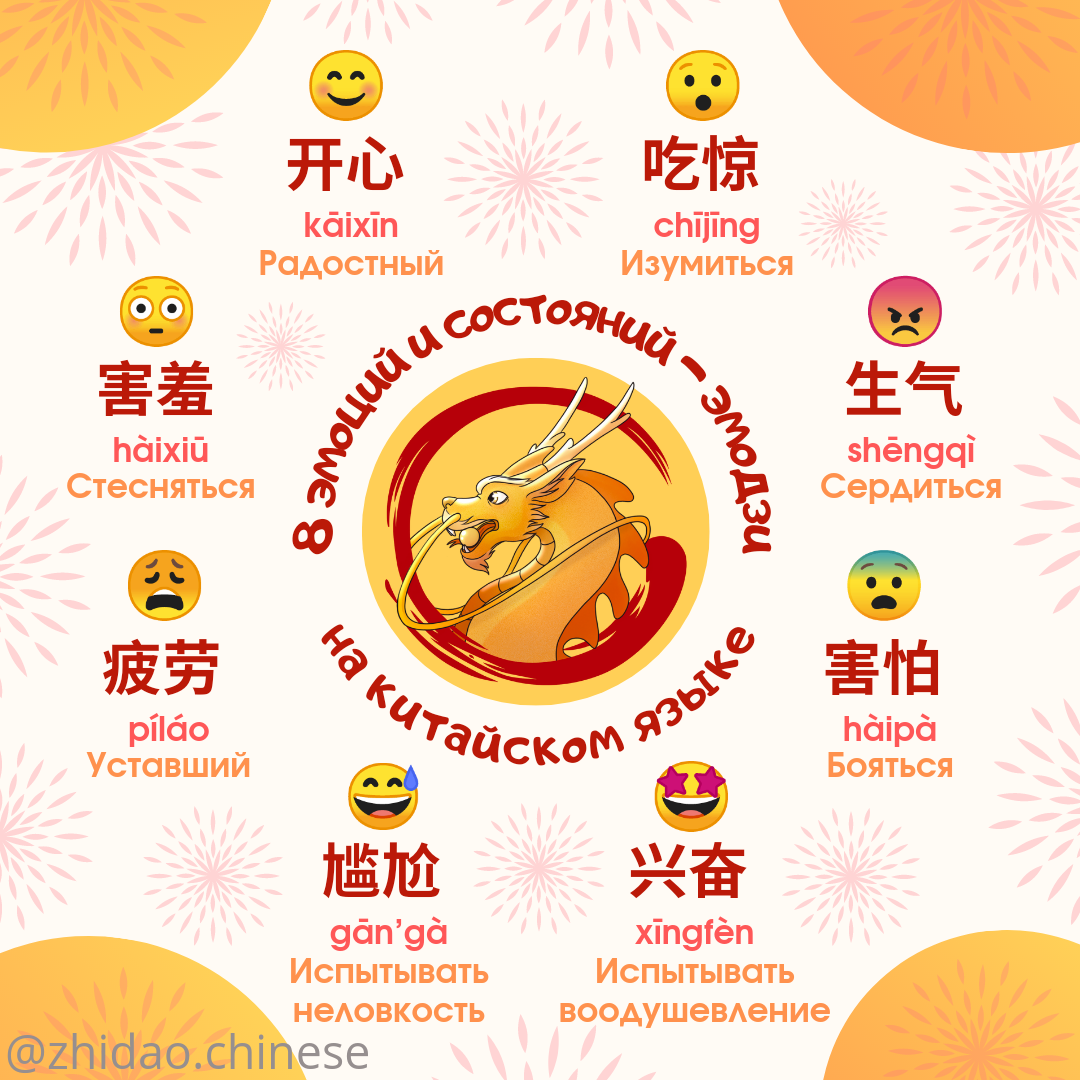 #zhidao_способы_сказать ? Сегодня делимся с вами восемью эмоциями и состояниями в виде эмодзи! На самом деле, эмодзи (绘文字 huìwénzì) пришли из Японии, по-японски эти иероглифы как раз и читаются как "emoji" 😉 Однако разнообразные смайлики получили повсеместное распространение и стали очень популярны в том числе и в Китае 🀄 Если вы введёте слова нашей подборки с китайской клавиатуры, поддерживающей эмодзи, она выдаст вам соответствующий смайлик 😊 1️⃣ 开心 kāixīn радостный, веселый 2️⃣ 吃惊 chījīng изумиться, напугаться, поразиться 3️⃣ 生气 shēngqì сердиться, гневаться 4️⃣ 害怕 hàipà бояться, пугаться 5️⃣ 兴奋 xīngfèn испытывать воодушевление/подъем, волноваться 6️⃣ 尴尬 gān’gà сконфуженный, испытывать неловкость 7️⃣ 疲劳 píláo уставший, изнурённый, утомлённый 8️⃣ 害羞 hàixiū стесняться, смущаться, стыдиться 📝 Ссылка на карточки Quizlet для изучения новых слов: https://quizlet.com/_bs37tq?x=1qqt&i=2r5snr ❗В Quizlet вы можете послушать произношение всех слов! Для этого нажмите на значок м