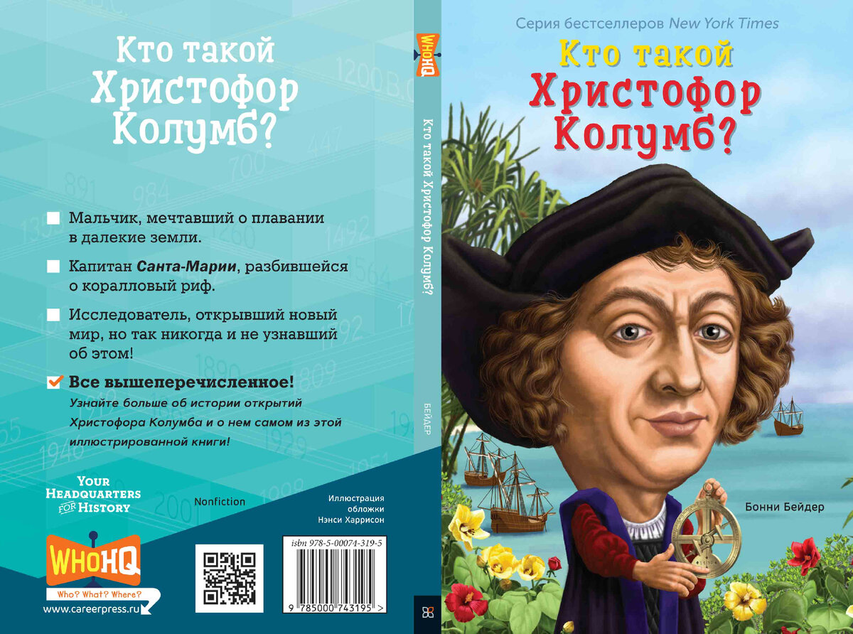 Эта серия аналогична отечественной серии ЖЗЛ, только предназначена для детей младшего школьного возраста, а точнее для детей 7-10 лет. Поэтому в книгах о великих людях обязательно говорится об их детстве. Ина каждой странице книг есть иллюстрации. Новинки серии, которые выходят на днях: Кто такой Христофор Колумб? Мы, конечно, знаем, кто он такой. Но все же не только дети, но и взрослые узнают о великом открывателе Нового Света много нового. Рассказано о детсве мореплавателя, его одержимости Индией, о том почему и как он решился плыть на Запад. Колумб не только не знал, что открыл новый континент, но и был уверен, что добрался до Индии. а самое интересное, чо все в его истории складывалось совсем не гладко. Открытие карибских островов - это маленький проствет в череде неудач. Он долго не мог получить корабли. Он не мог убедить команду. Его в конце концов посадили в тюрьму прямо в Америке. При нем Васко да Гама добрался до Индии, а Бартоломеу Диаш и Америго Веспуччи сделали свои открыти