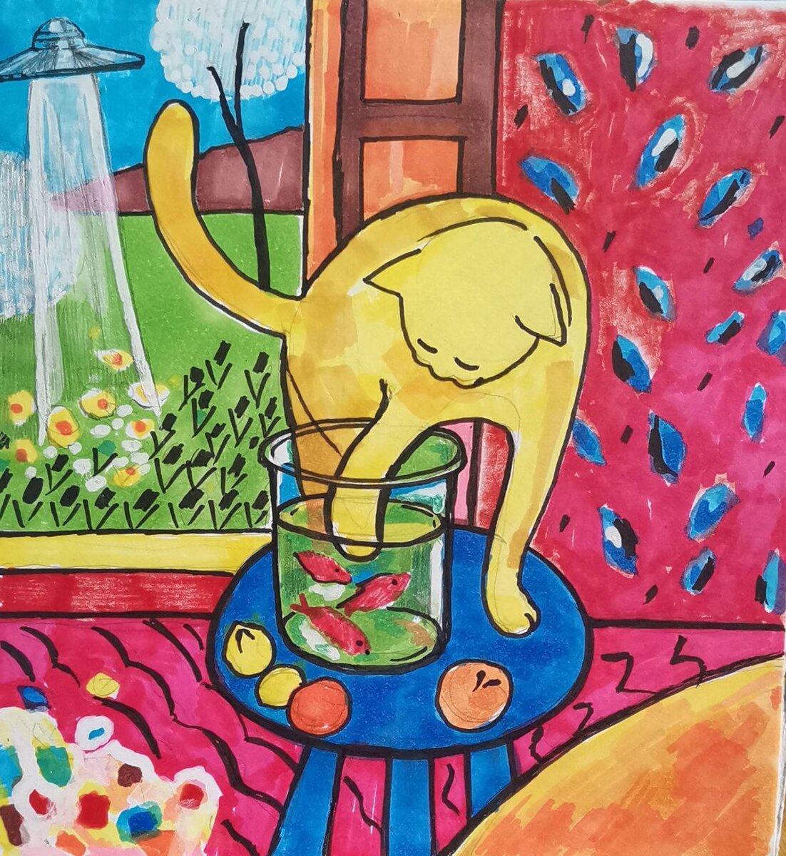 Желтый кот охотится за красными рыбками!!! Мнения расходятся! Некоторые приписывают эту работу Анри Матиссу -а некоторые на отрез отвергают даже мысль о том что Матисс мог такое написать!!! Что касается лично меня -я обожаю эту работу, кто бы ее не написал в оригинале! Сколько же потрясающих копий и интерпретаций этой работы можно найти в интернете! какие яркие и чистые цвета -а кот!? Я сама сделала серию NFT с желтым котом! Данное NFT уже давно куплено у меня -https://beta.disintar.io/profile/UQCy3sGFq1fHY0IFHT89RmJKxTWxafpIfFuH6QpEPpLHh0dg но есть и другие.... они тут: