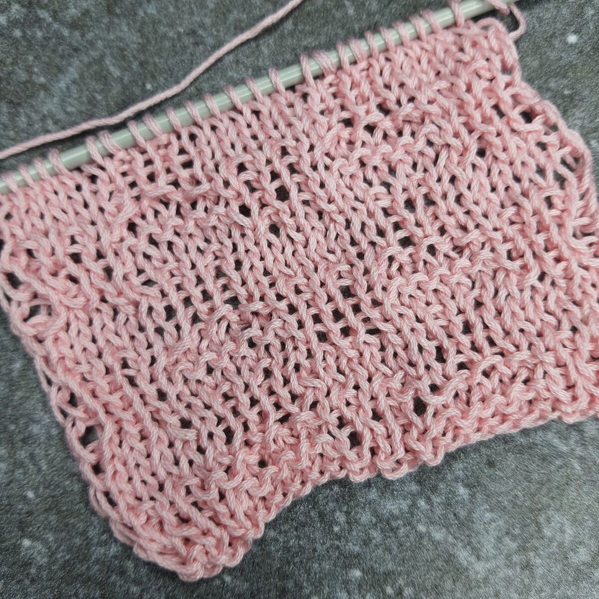 Ряд 1 : [1 лицевая, 1 изнаночная] × 2 раза, *7 лицевых, 1 изнаночная, 1 лицевая, 1 изнаночная; повторять от * до последней петли, 1 лицевая Ряд 2: 1 изнаночная, [1 лицевая, 1 изнаночная] × 2 раза, *5 лицевых, 1 изнаночная, [1 лицевая, 1 изнаночная] × 2 раза; повторять от * до конца ряда.