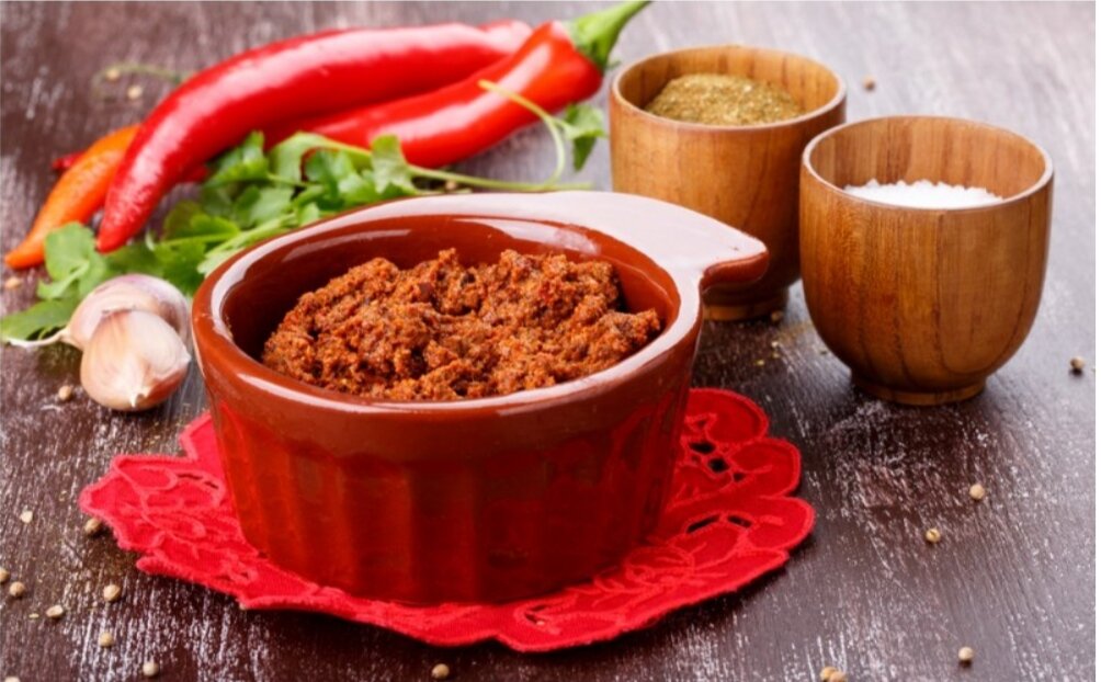 Главным ингредиентом натуральной традиционной аджики являются различные сорта перца. Добавки придают ей особой пикантности. Ароматная и острая аджика с хреном отлично сочетается с пловом, пельменями, салатом и любыми мясными деликатесами. Ингредиенты: Способ приготовления Помидоры вымойте, сделайте на них крестообразные надрезы, залейте кипятком на 20 секунд. Снимите кожуру. Болгарский перец вымойте, очистите от семян. Разрежьте на несколько частей. В блендере измельчите подготовленные томаты, болгарский и острый перец. Корень хрена вымойте и очистите от кожуры. Натрите на мелкой терке, избегая попадания брызг в глаза. Чеснок почистите и мелко нарежьте. Измельченную овощную смесь переложите из блендера в миску. Добавьте мелко нарезанный чеснок и натертый хрен, все перемешайте. Добавьте соль и уксус. Снова перемешайте и аджика готова. Подавайте как соус или приправу. Хранить такую аджику будет правильно в стеклянных банках с крышками в холодильнике.
