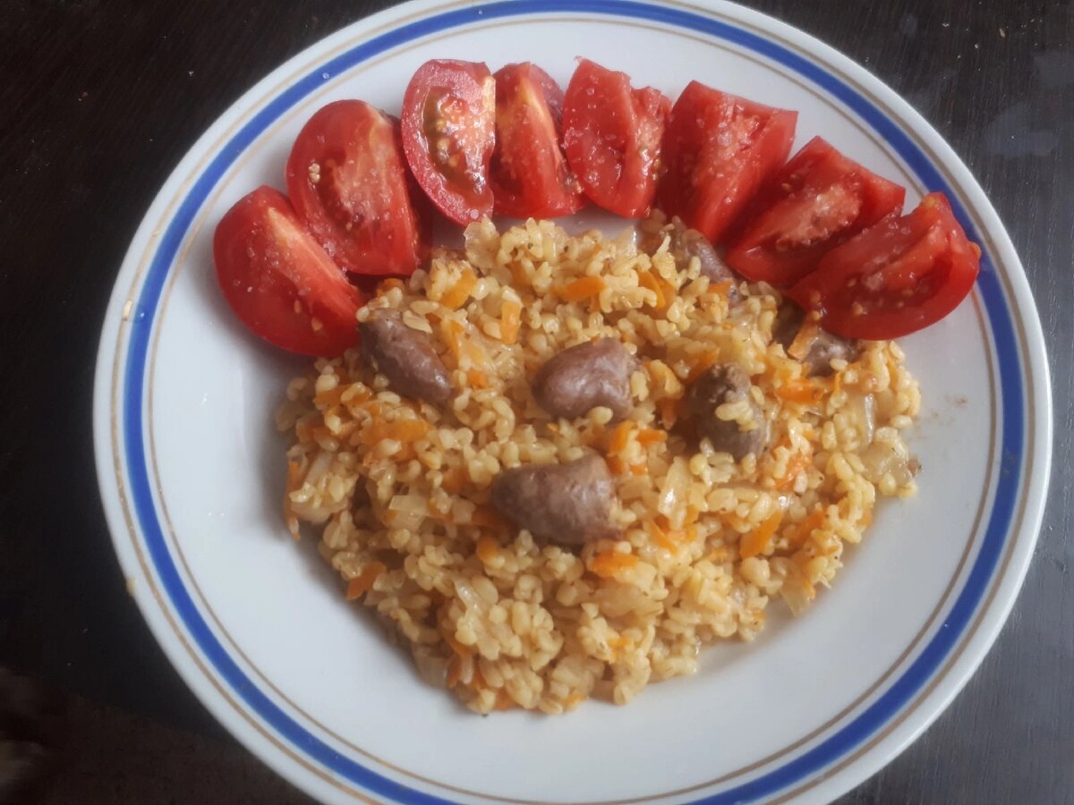 После окрошки и борща, плов - самое враждебное блюдо. В смысле того, что нюансы приготовления у каждого свои. Я опять же всего лишь предлагаю поэкспериментировать на своей кухне. И просто попробовать что - то вкусненькое и новенькое😉 💥ПЛОВ ИЗ БУЛГУРА И КУРИНЫХ СЕРДЕЧЕК💥 🍴булгур 🍴куриные сердечки 🍴много лука (3 - 4 головки) 🍴морковь 🍴растительное масло 🍴соль, перец и др специи по вкусу 🍴чеснок по вкусу (я то добавляю его в гигантских масштабах, то готовлю вовсе без него). В этот раз сердечки у меня были куплены в виде полуфабриката - маринованные. И мягче. Когда берёте обычные, учитывайте этот момент во времени готовки. И ещё. Немаринованные сердца лучше разрезать вдоль пополам и удалить кровяной сгусток, а затем промыть. Лук, морковь (и, если есть, чеснок) чистим. Лук шинкуем произвольно, морковь - некрупной соломкой, чеснок мелко рубим. В казане (или в чём вы будете готовить) разогреваем достаточное количество масла, быстро обжариваем сердечки. Затем добавляем лук, жарим до
