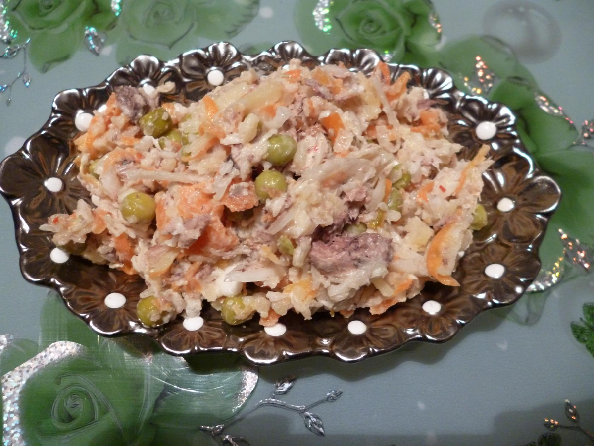Ингредиенты:тунец консервированный - 1 банка; картофель-300 г; капуста свежая-300 г; морковь-200 г; лук репчатый -2 головки; горошек зеленый-200 г; соль, специи- по вкусу; майонез- 125 г.