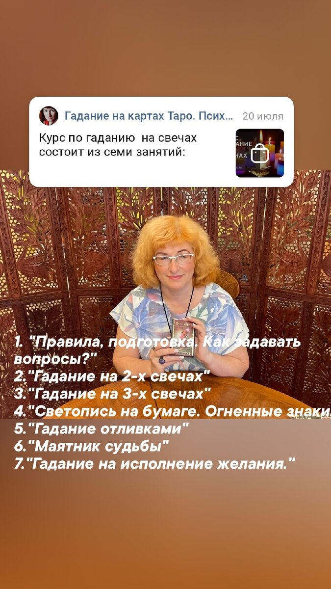 Курс по гаданию на свечах состоит из семи занятий: 1. "Правила, подготовка. Как задавать вопросы?" 2."Гадание на 2-х свечах" 3."Гадание на 3-х свечах" 4."Светопись на бумаге. Огненные знаки." 5."Гадание отливками" 6."Маятник судьбы" 7."Гадание на исполнение желания." Ссылка для заказа курса: https://vk.com/taro_kirov_1270?w=product-60163134_6073879