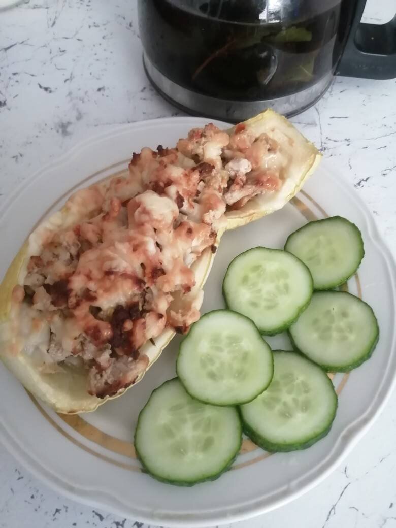 Начался сезон кабачков! #июль Ингредиенты: средних кабачка, Фарш (у меня индейки), Лук, Помидор средний, Сыр, Масло растительное, Специи Способ приготовления: В сковороду наливаем масло, выкладываем фарш, режем лук и помидор. Разрезаем кабачки, ложкой вытаскиваем серединки, чтоб вышли лодочки. Серединки режем кусочками и отправляем его к фаршу. В готовую начинку добавляем специи. Можно добавить зелень. Натираем отдельно сыр. Разогреваем духовку до 180°С. В форму выкладываем наши лодочки, в них горячую начинку, сверху посыпаем обильно сыром. Отправляем в духовку на 35-40 минут. Приятного аппетита!
