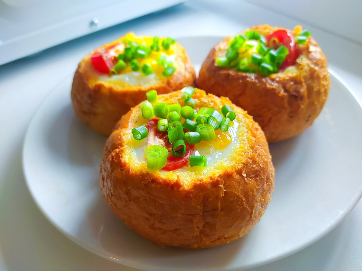 Яичница на завтрак с колбасой, помидором и сыром в горшочке из булочки