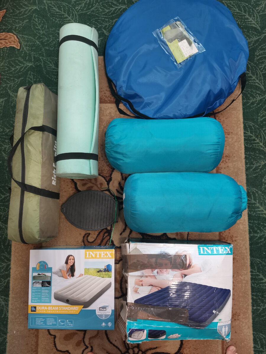 Ну что ж, начинаю собирать вещи. Часть отдыха пройдёт в городских условиях, часть дикарями в палатках. Едем семьей. 2 взрослых, 2 ребёнка. ✅ Для начала самые габаритные вещи. 1. Палатка. Она у нас небольшая, но думаю ещё хватит на этот год. У неё есть 3 спальных места и тамбур. 2. Пенка. На фото одна, две катаются в машине. Итого 3. 3. Спальники. На фото два наших. Ещё 2 возьмём у родственников. Итого 4. 4. Матрац надувной большой и маленький. Итого 4 места. 5. Палатка для душа и переодевания. Её мы купили в этом году, ещё не опробовали. Обязательно расскажу и покажу сие чудо. 6. Насос. ✅ Из мебели беру 4 складных стула и 1 складной стол. Фото нет, они тоже живут в машине. ✅ Постельное белье в этот раз брать не буду. Лишние тряпки туда - сюда трясти. Возьму лишь пару пледов и подушки. Всё равно спать в спальниках у воды. ✅ Газовая печка с балончиками. Супер вещь. Небольшая, удобная. ✅ Холодильник в машину. Он работает от прикуривателя. Хорошо держит холод. Брали в мае, уже оцен