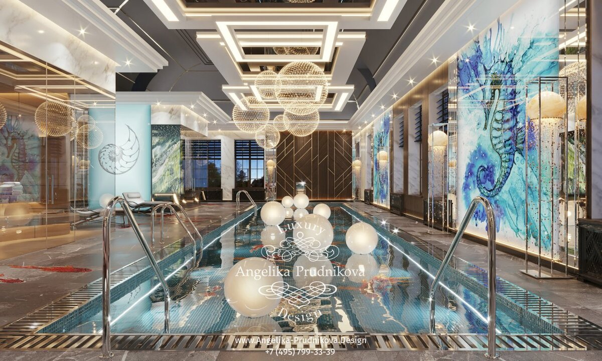 Этот великолепный проект можно с полным правом назвать одой морю, а тон в нем задают эксклюзивные панно с изображением морских коньков и раковин. Атмосферно смотрятся и светильники-шары — матовые плавающие «жемчужины» и золотистые подвесные сферы. Здесь есть все, что нужно для приятного отдыха: удобные шезлонги, купель-джакузи и массажный водопад.