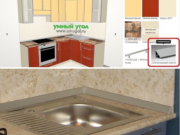 По умолчанию у нас в проектах посчитан алюминиевый уплотнительный плинтус. Также вы можете выбрать пластиковый уплотнительный плинтус в цвет столешницы.