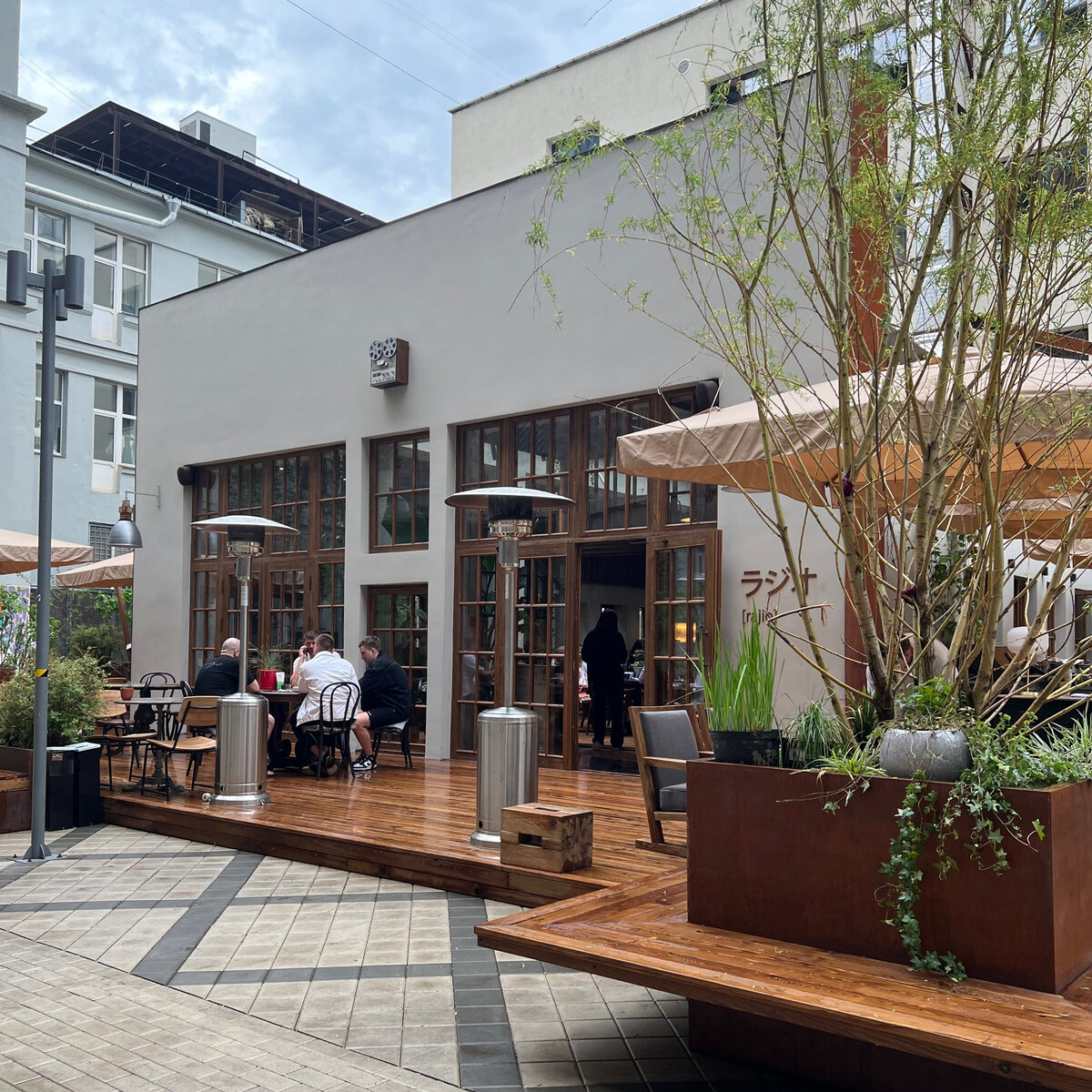 Район Бауманской. Вокруг стройки, заборы и массивные сталинские здания. Технический переулок. С одной стороны Московский художественно-промышленный институт, с другой – Московский государственный технический университет им. Н.Э. Баумана, а между ними новое коммерческое офисное пространство «Суперметалл». Именно там, а точнее во внутреннем дворе, разместился новый ресторан-оранжерея Radio от создателей проекта Blanc. Правда, найти и сам комплекс, и «радиоточку» непросто. Указателей нет. Навигатор заводит не туда. Выцепить взглядом нужные двери среди строительных лесов сложно. В бизнес-центре тоже пусто и тихо, нужно блуждать среди турникетов, проходов и закутков. Пользуясь методом заглядывания во все окна и двери, сигнал «Радио» я обнаружил во дворе, в белой пристройке с деревянными окнами, которую с трех сторон обнимал деревянный настил веранды под тентами.