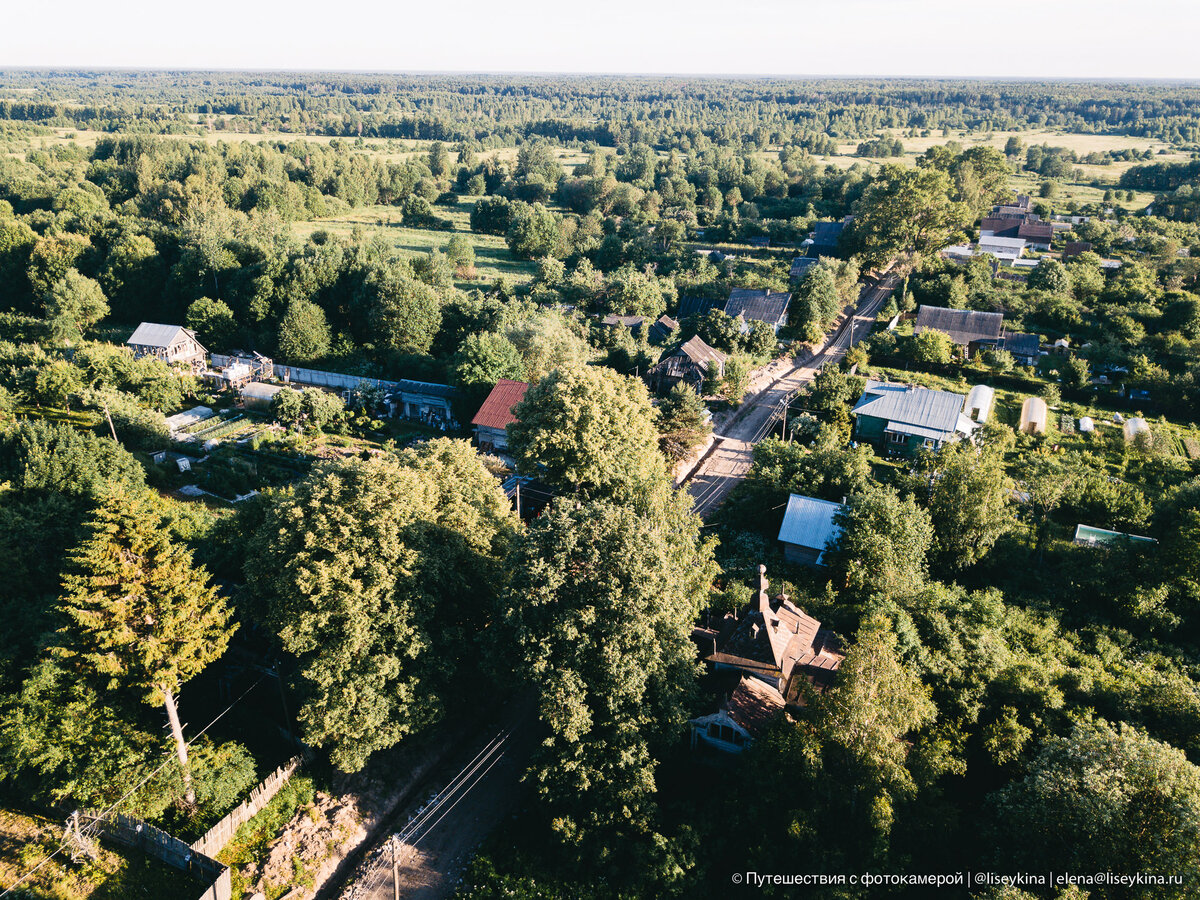 10 километров по разбитой дороге с ямами в половину колеса, и вот неприметная дорожка отходит вправо. Мне туда. Небольшая тупиковая деревня на пару десятков домов. Удивительный терем, притаившийся за густой листвой деревьев, я заметила не сразу. Пришлось доехать до конца деревни, упереться в поле и развернуться. И только на обратном пути над деревьями стала заметна металлическая башенка удивительного терема. В деревне всего один постоянный житель. Все остальные - дачники, которые приезжают только летом. И они достаточно бдительно и ревностно относятся к теремку. Каждый раз настораживаются, когда видят чужаков, и выходят "поздороваться". Так, во время своего пребывания там я познакомилась с тремя местными дачниками. Милейшими людьми, которые просто переживают, как бы охотники за стариной не растащили теремок "на сувениры". Один из моих собеседников рассказал, что ещё в прошлом году на втором этаже были оконные рамы и стёкла. А несколько лет назад - и все окна на месте. Удивительно, к