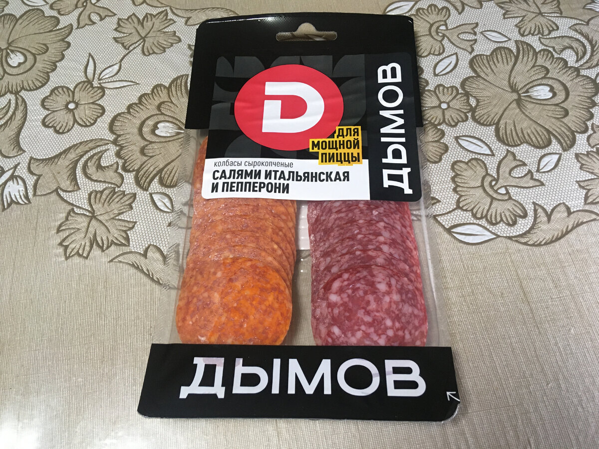Хотел на закуску чего-то мясного. Купил на пробу сырокопченые колбасы дымов, ассорти. Пепперони и салями итальянская нарезка, 90Г. Со скидкой за 69.90 рублей в Бристоле. Состав пепперони: на первом месте - свинина, говядина, шпик, животный белок (свиной, говяжий). Салями итальянская: на первом месте - свинина, шпик, говядина, нитритно-посолочная смесь (соль, фиксатор окраски-нитрит натрия). Вроде не написано, про Е добавки, но есть всякие консерванты, антиокислители, глутамат натрия, краситель (кармин). Но сейчас везде эти добавки. По сегодняшним меркам, тут состав, можно сказать, почти натуральный. При крупном плане, салями итальянская, имеет вполне такой колбасный вид, на сколько я сам в этом разбираюсь, конечно. У пепперони же, много жира. На вкус немного солоноватые! Съев их всех за раз, надо будет чем-то сразу запивать. Есть можно, но не на постоянно, все таки, колбаса с таким количеством жира не очень полезна, хоть и состав не такой опасный. Запах, нормальный. Не уверен, чт