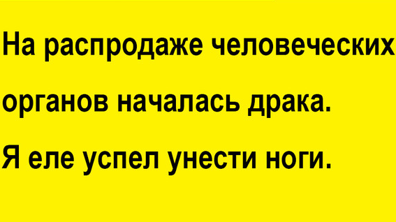 — Все умрут! Ужас, что я наделал! 3. Однорукий человек заплакал, увидев магазин «секонд-хенд». 4. Был у родителей сынишка. Ни ручек, ни ножек, одна голова. Годы летели, и вот на шестнадцатилетие родители ему и говорят:
