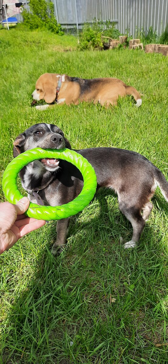 Принеся собачку домой я стала ломать голову. Мне нужно было убедить мужа разрешить оставить ее дома хотя бы на время. Пять собак - это явный перебор 😁, не считая двух котов, трех попугаев и двух уток ( но это уже совсем другая история и обо всем буду рассказывать по порядку). Я стала уговаривать мужа дать мне немного времени для того, чтобы найти собачке нового хорошего хозяина . Спустя пять минут уговоров мне дали добро и наша лесная находка осталась у нас. Щенок (да, наша находка оказалась щенком) быстро освоился у нас во дворе. Для проживания мы выделили ему свободную гостевую будку, но такие апартаменты пришлись ей не по вкусу и она быстро самовольно переселилась на диван в летнюю кухню. Со всеми моими собаками она быстро нашла общий язык и уже через 30 минут пребывания у нас в гостях она весело бегала и играла с Лилей и Хелли. Щенок оказался девочкой. Совсем крохотной, ласковой и озорной. Теперь оставалось только придумать ей имя.