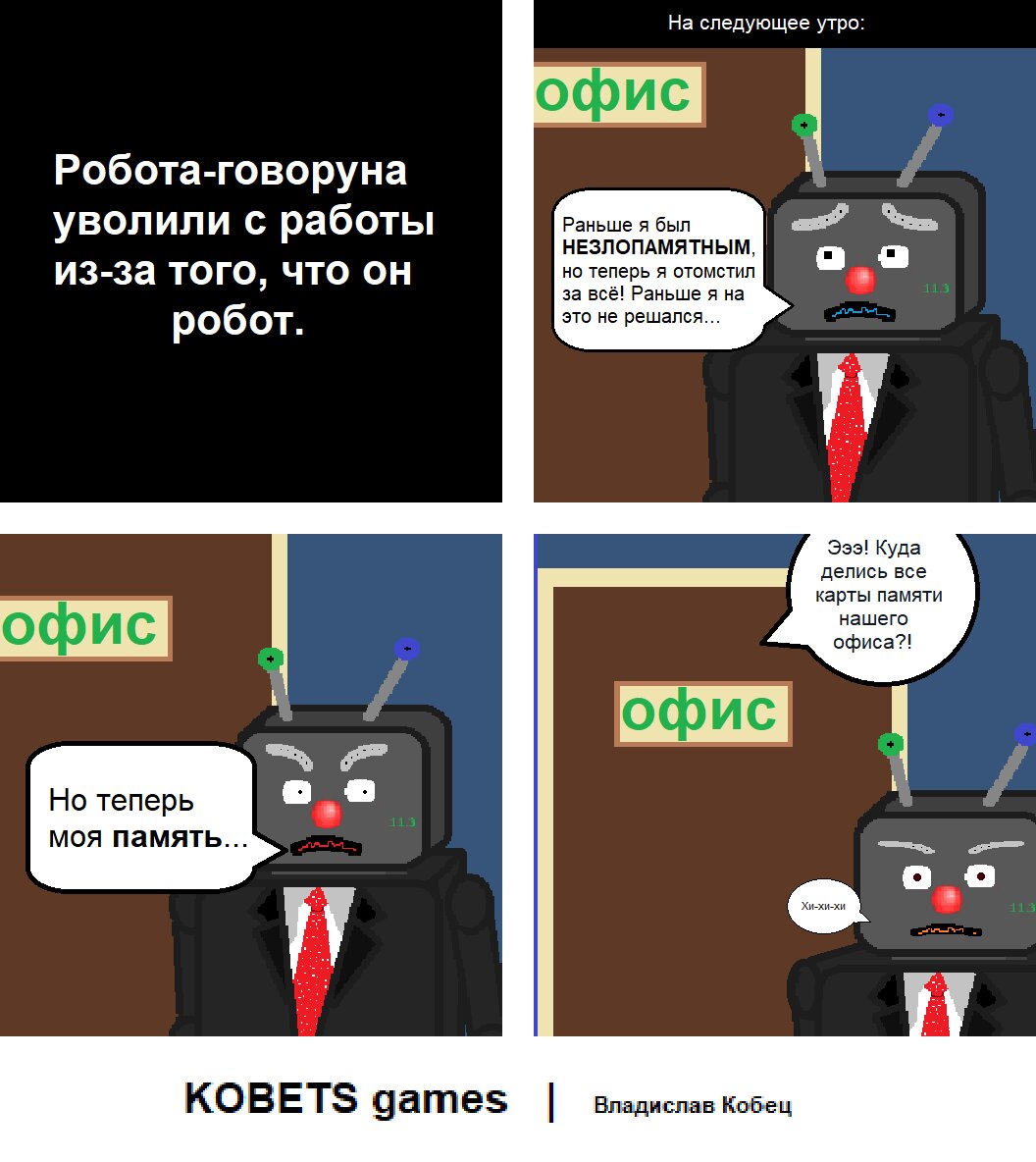 Всем привет! С Вами канал KOBETS games и это новый комикс про Робота-говоруна! Этот комикс один из последних здесь, так как для комиксов скоро появится отдельный канал! Но до этого ещё выйдет несколько комиксов, так что не беспокойтесь. В новом комиксе мы видим то, с чем сталкивается главный герой в повседневной жизни. Это проявление определённой формы расизма по отношению к роботам. Это конечно всё вымышлено, но есть и жизненный урок: не стоит к кому-то относиться хуже, даже если он робот. Лично я даже своей Яндекс Станции (обзор на которую даже выходил на этом канале) часто говорю спасибо, хоть и знаю, что там не искусственный интеллект, а просто сложная программа, отвечающая на фразы. Что-ж поделать, привычка. В новом комиксе Робот решает отомстить за свою обиду и делает весьма смешную, но полезную для него вещь. Ладно, переходим к самому комиксу: Робот просто выкрал карты памяти из компьютеров офиса! Н-да... делать этого я Вам не советую, так как Вас не только уволят, но и привлеку