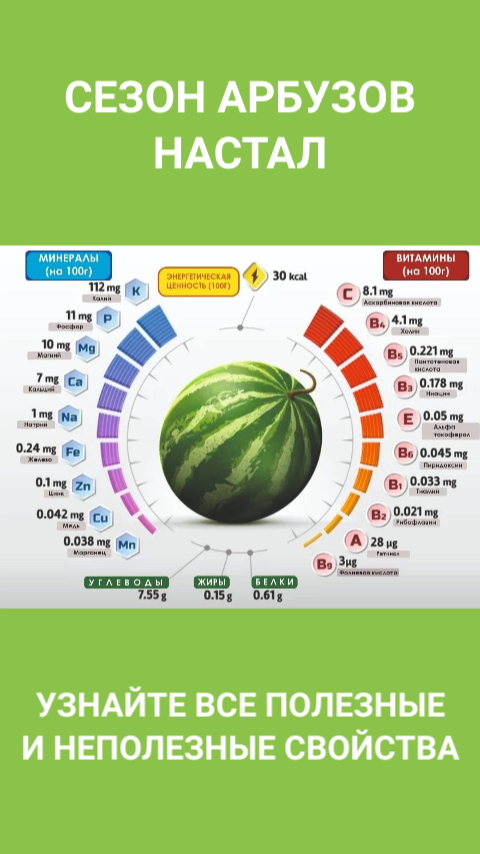 Начался сезон арбузов и поэтому хочу дать короткую информацию для его любителей. Я сама очень люблю арбуз, но изучив все его полезные и не очень полезные свойства, теперь употребляю этот плод умеренно. Арбуз относится к ягодам, и начну я с полезных качеств. В спелом арбузе мякоти содержатся глюкоза и фруктоза. По мере хранения плода скапливается сахароза. Содержание таких сладостей составляет около 13 процентов, но они усваиваются организмом легко. Калорий в ягоде не много, 100 гр. мякоти состоит из 38 ккал. Но содержится очень большое количество сахара. Для людей, страдающих избытком сахара в крови, употреблять нужно этот сладкий продукт с осторожностью. Арбуз имеет в своем составе ретинол (витамин А), аскорбиновую кислоту (витамин С), витамин Е, а также витамины группы В. Богат микроэлементами и антиоксидантами, необходимыми для организма человека. Содержащиеся в арбузе магний и различные антиоксиданты способствуют бороться со стрессами и помогают обрести радостные ощущения. Вмест